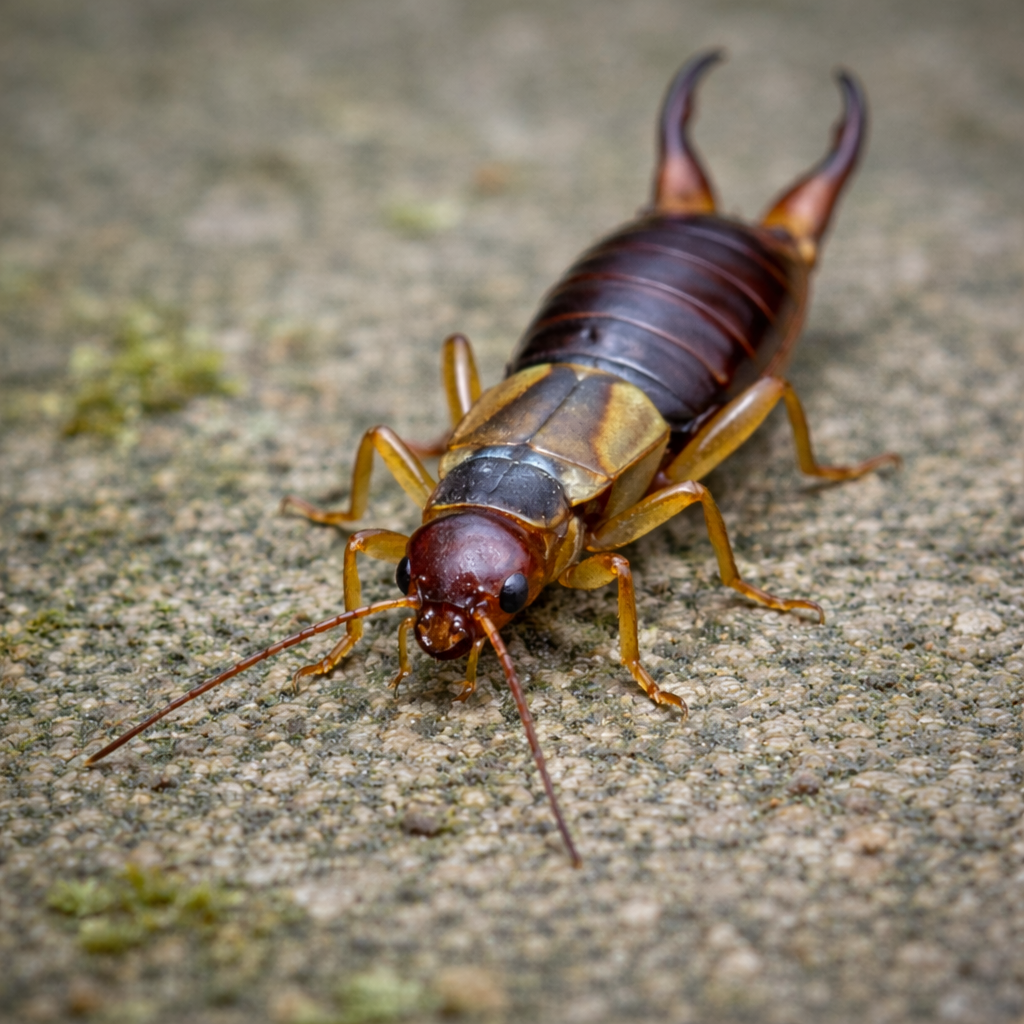 Identification: Brown insects with forceps-like pincers.