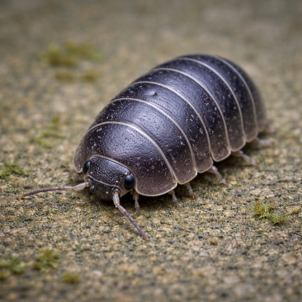 Pill bugs or sow bugs (commonly called roly-polies) are small, oval-shaped, crustaceans with hard, segmented exoskeletons that allow them to roll into a ball when threatened. They are typically gray or brown and thrive in moist, dark environments, feeding on decaying organic matter.