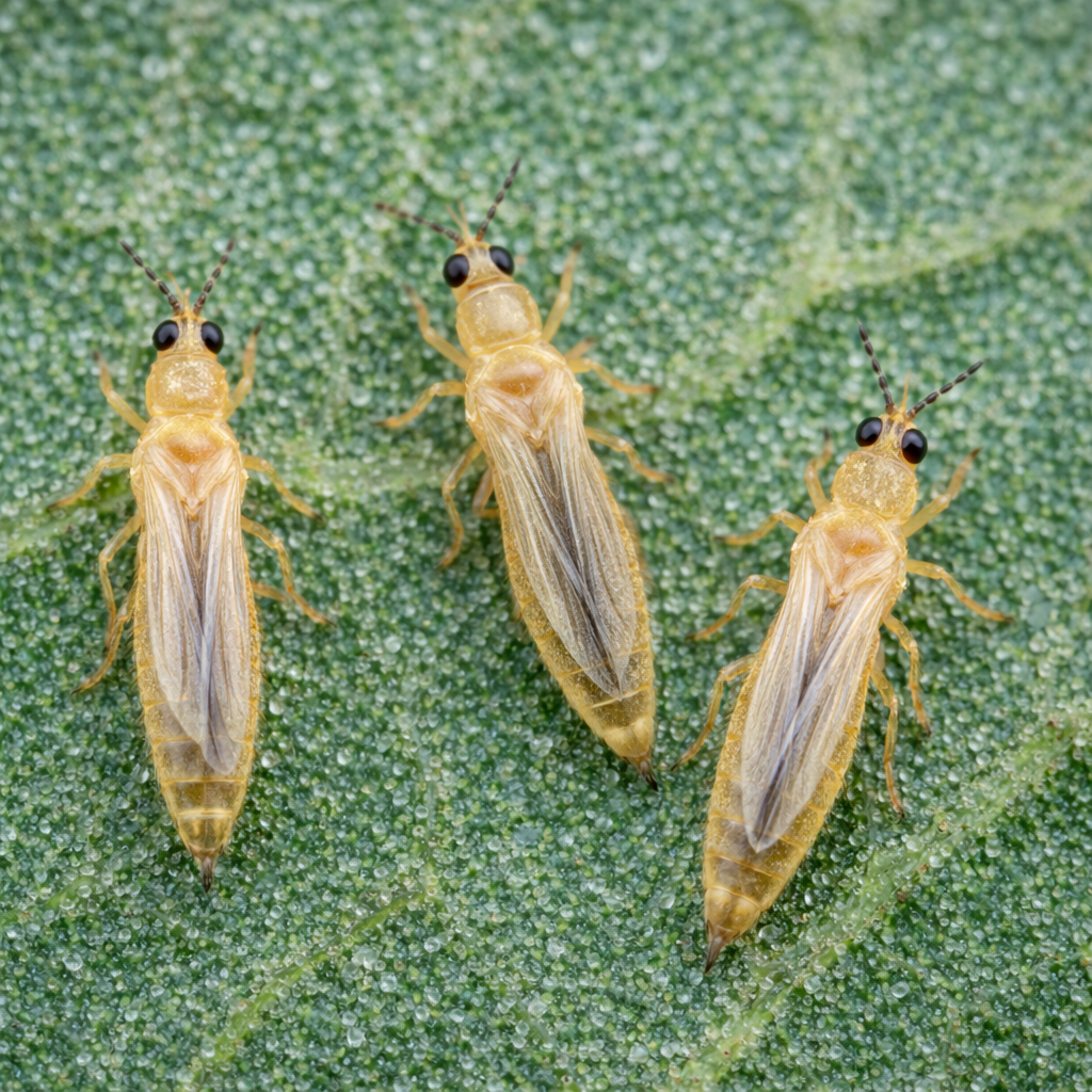 Identification: Small, slender insects scraping plant surfaces.